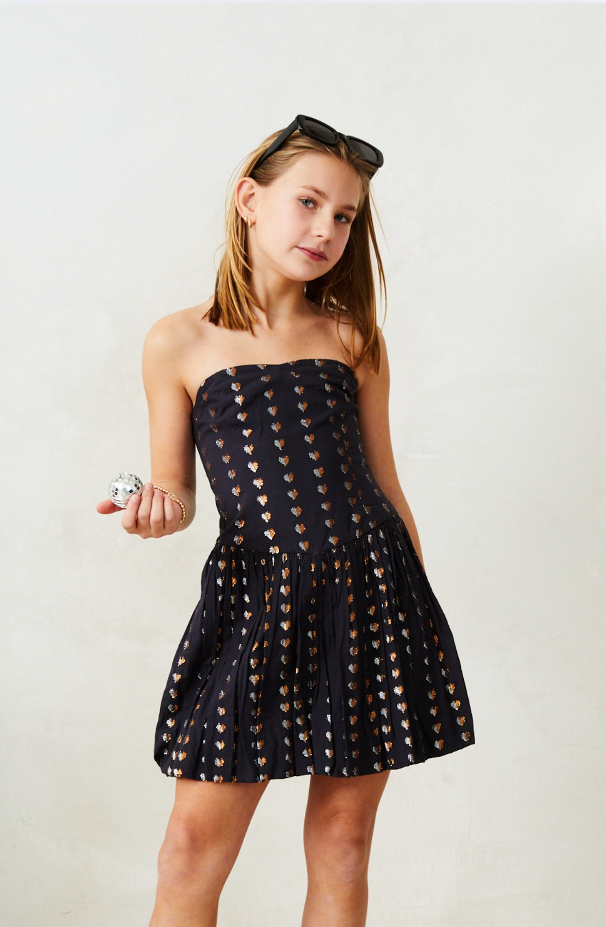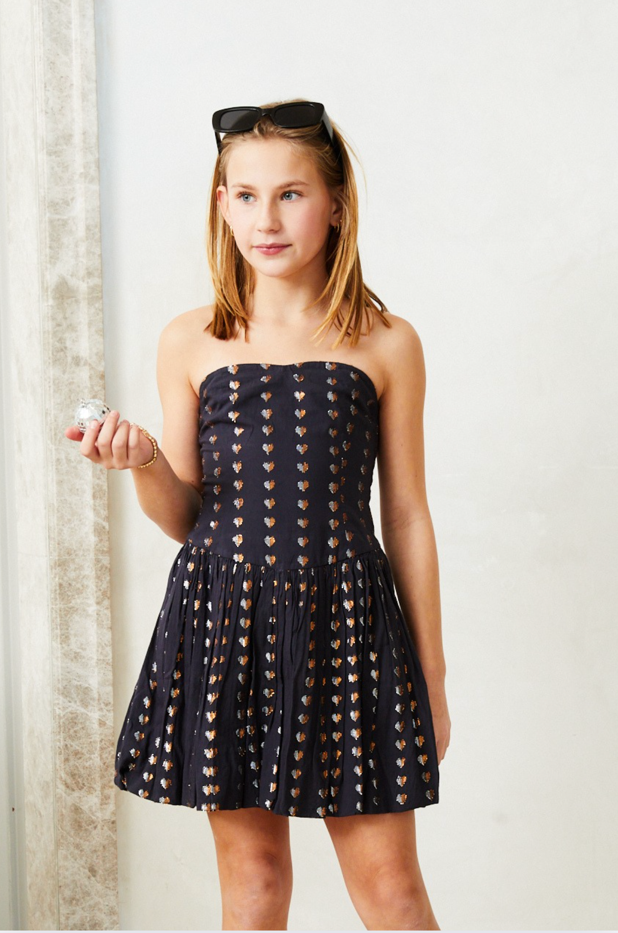 The Daniela is so girly and so pretty. We love the silver and told lurex hearts! And, the fit is so flattering on everyone! It is really so special! You will love this dress.