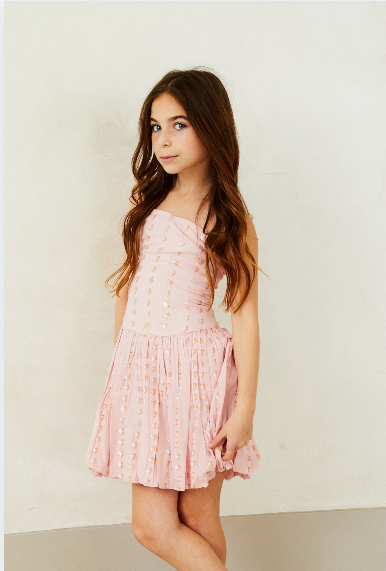 The Daniela is so girly and so pretty. We love the silver and told lurex hearts! And, the fit is so flattery on everyone! It is really so special! You will love this dress.