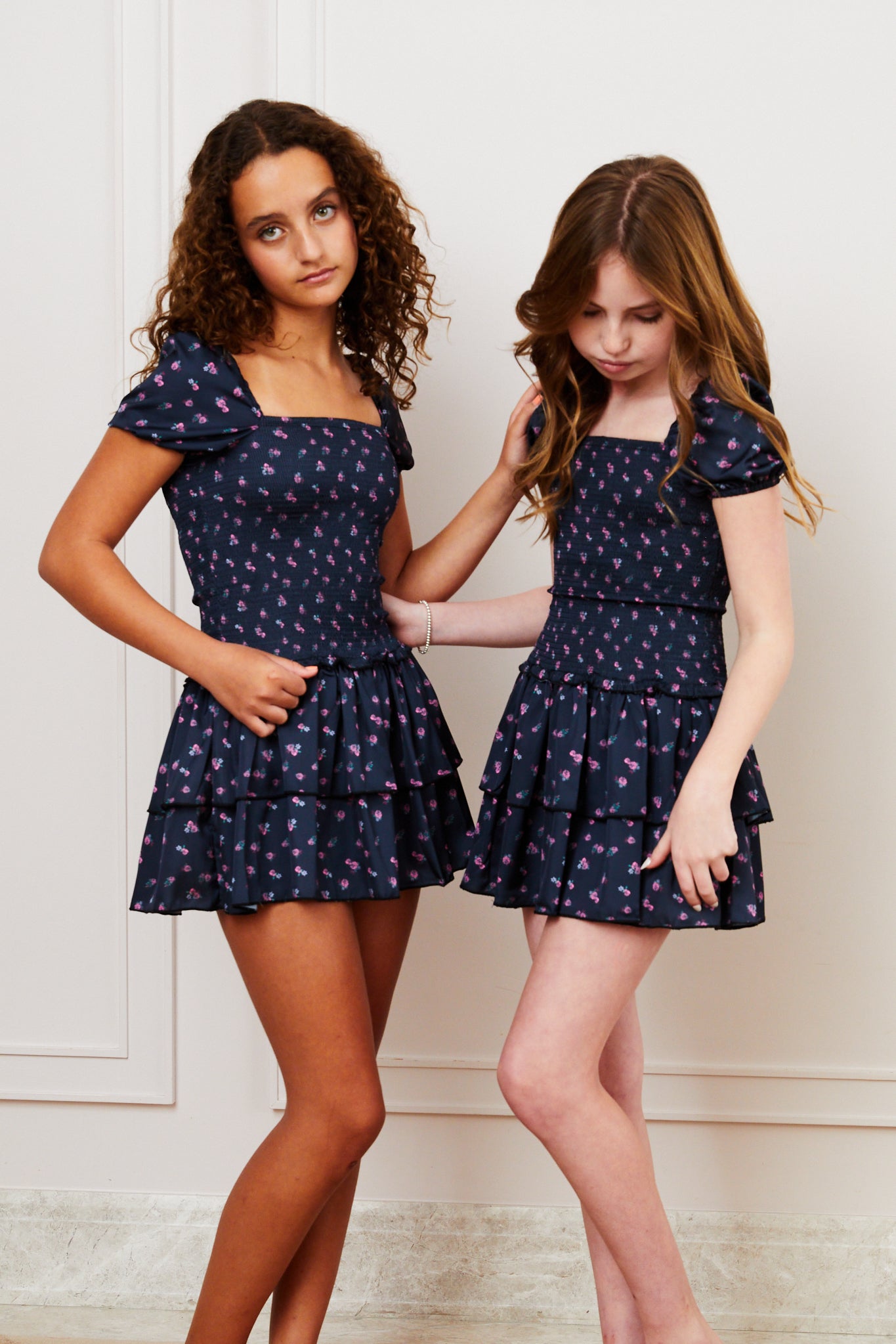 The Lexi Cap sleeve smocked satin ruffle skirt dress. We love the smocked waist and cute ruffles! Perfect with one of our matching tops. You will feel so beautiful and special from the moment you put it on! Satin is so silky and comfortable to wear!