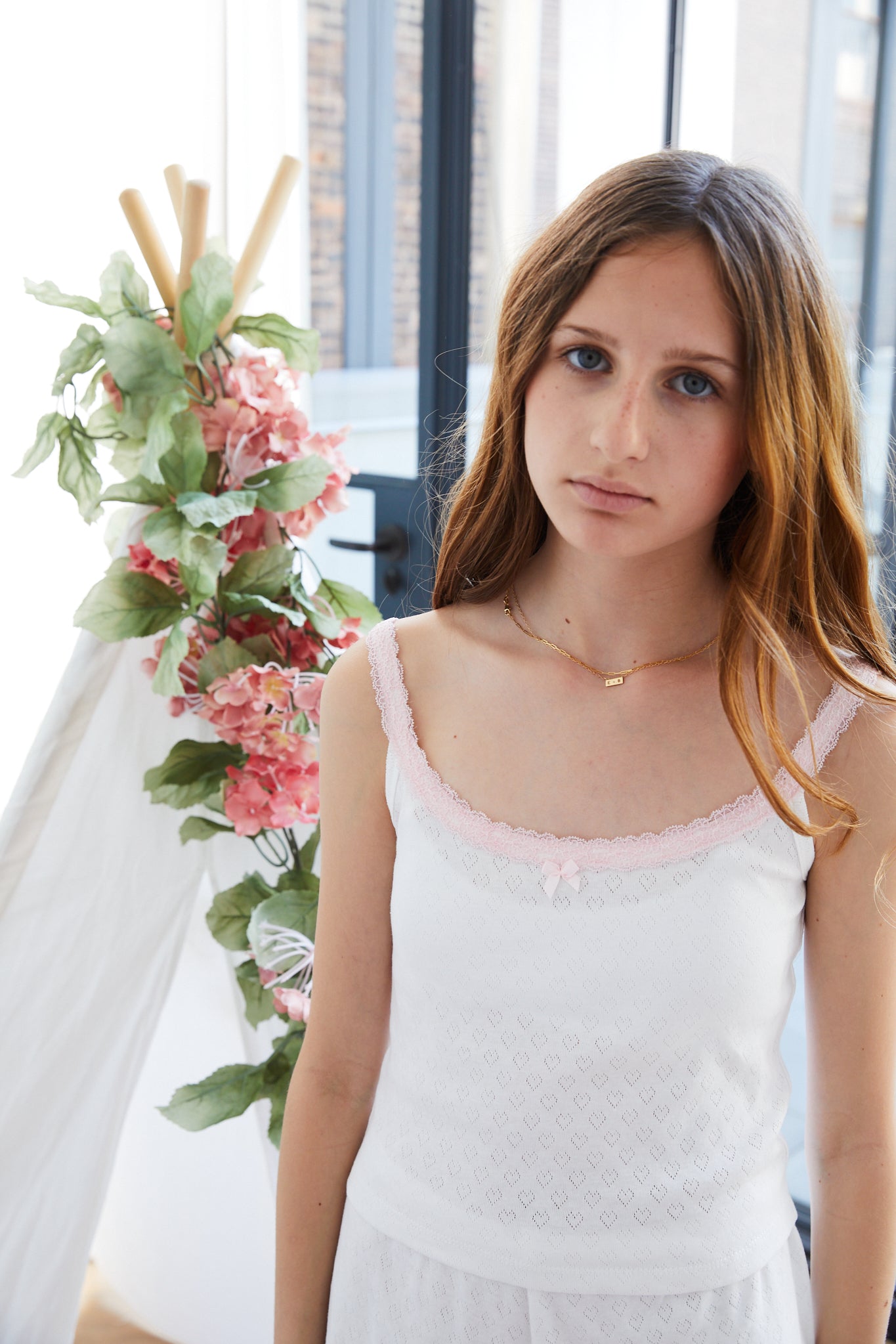 Lizzie White Heart Pointelle Tank with Pink Lace