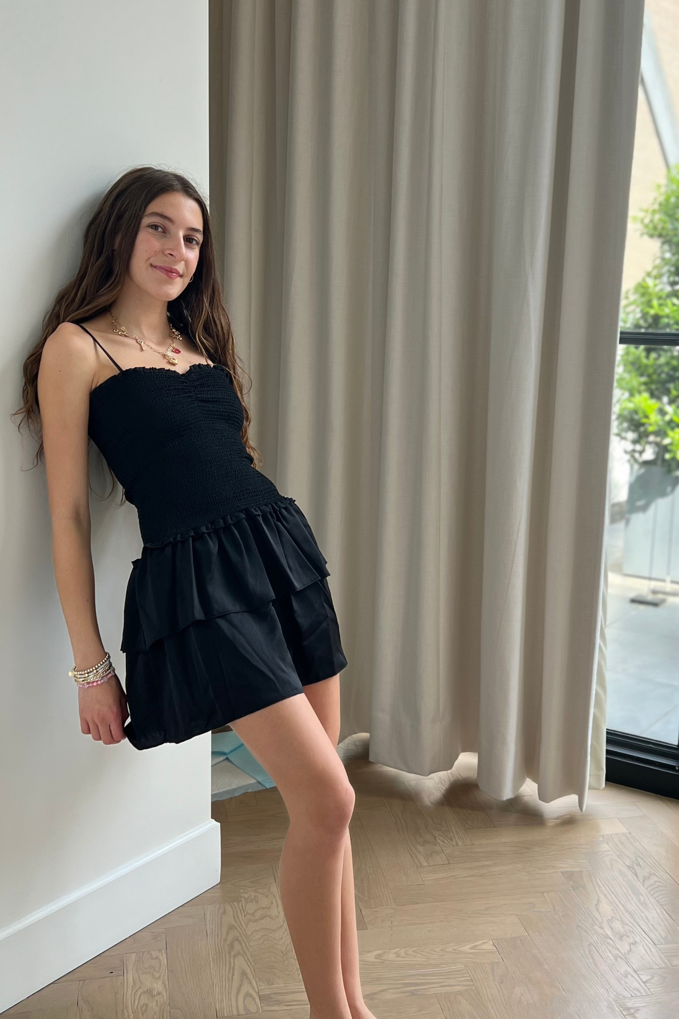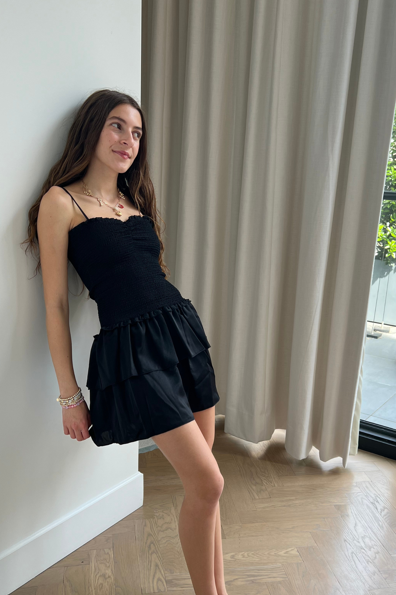 Lola Black Satin Smocked Ruffle Dress