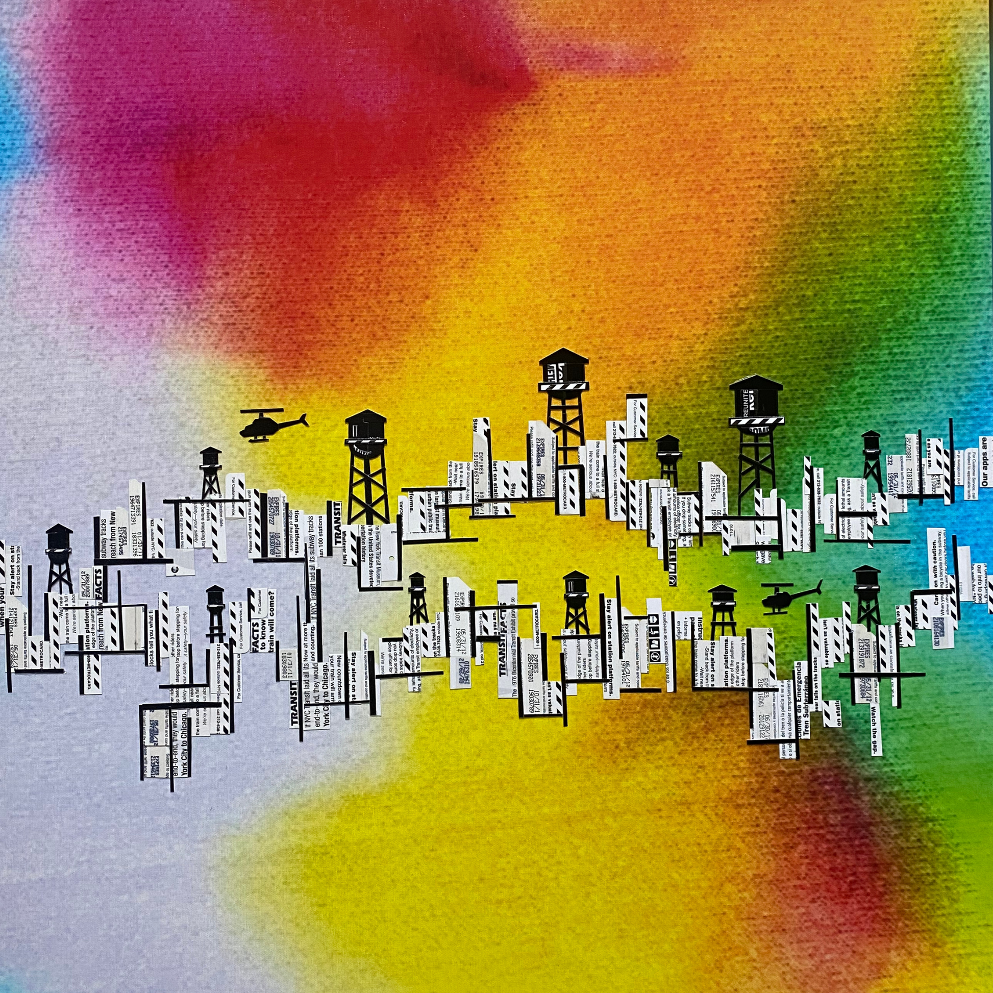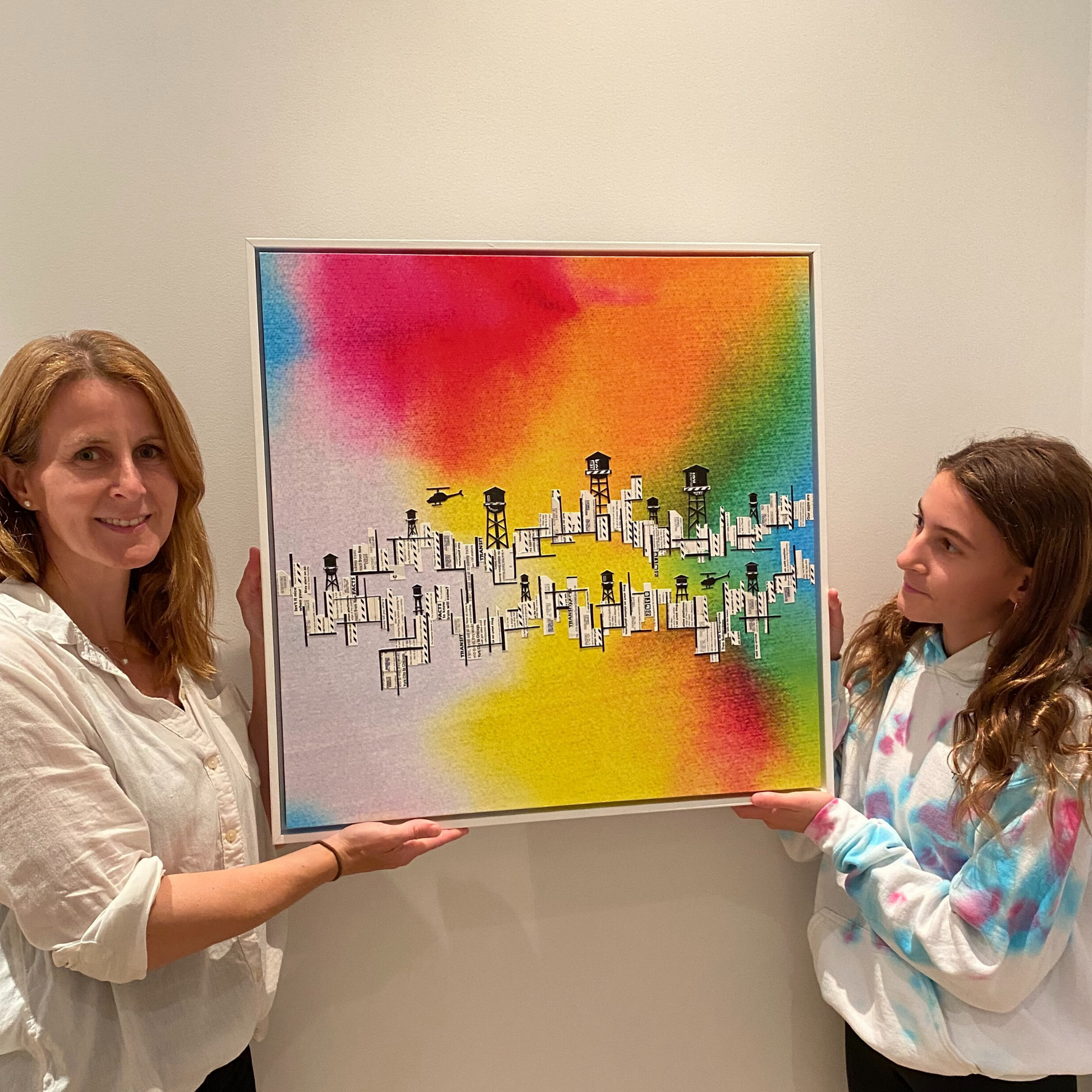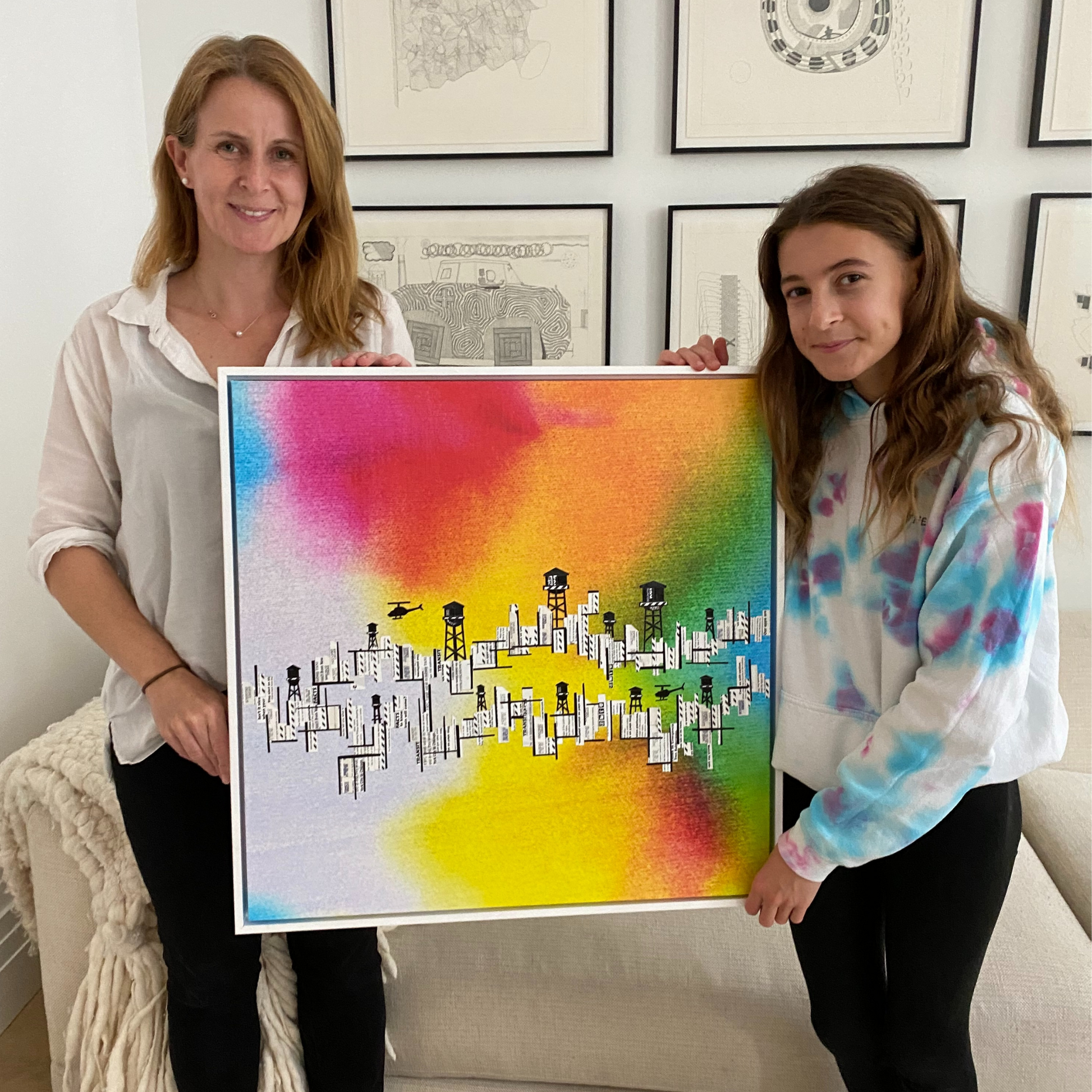 Nina up-cycles New York City subway cards and cuts them into incredible city scapes. She layered these cards perfectly onto my original dyed canvas artwork to create a city floating on my rainbow background. The sale of this custom piece will support the Children's Museum of the Arts in New York City. A place that is meaningful to both of us.